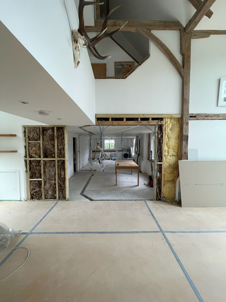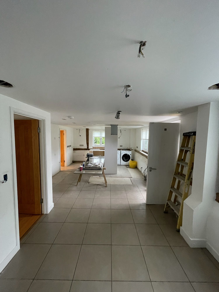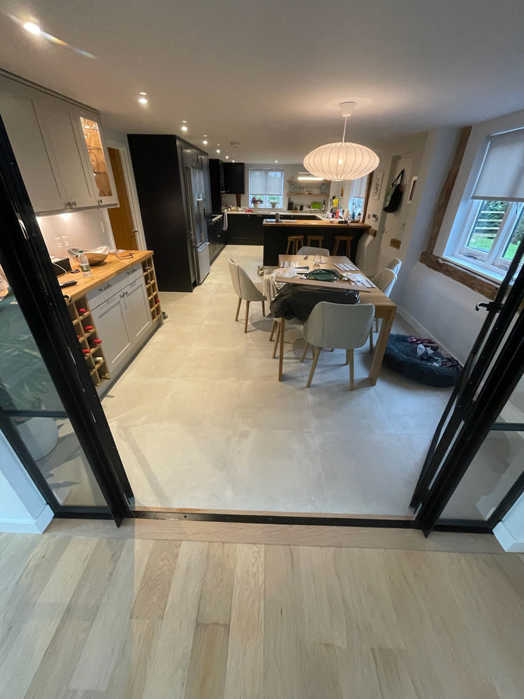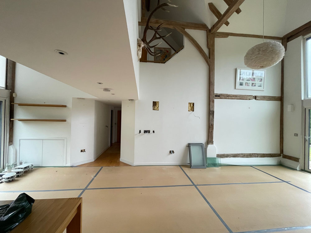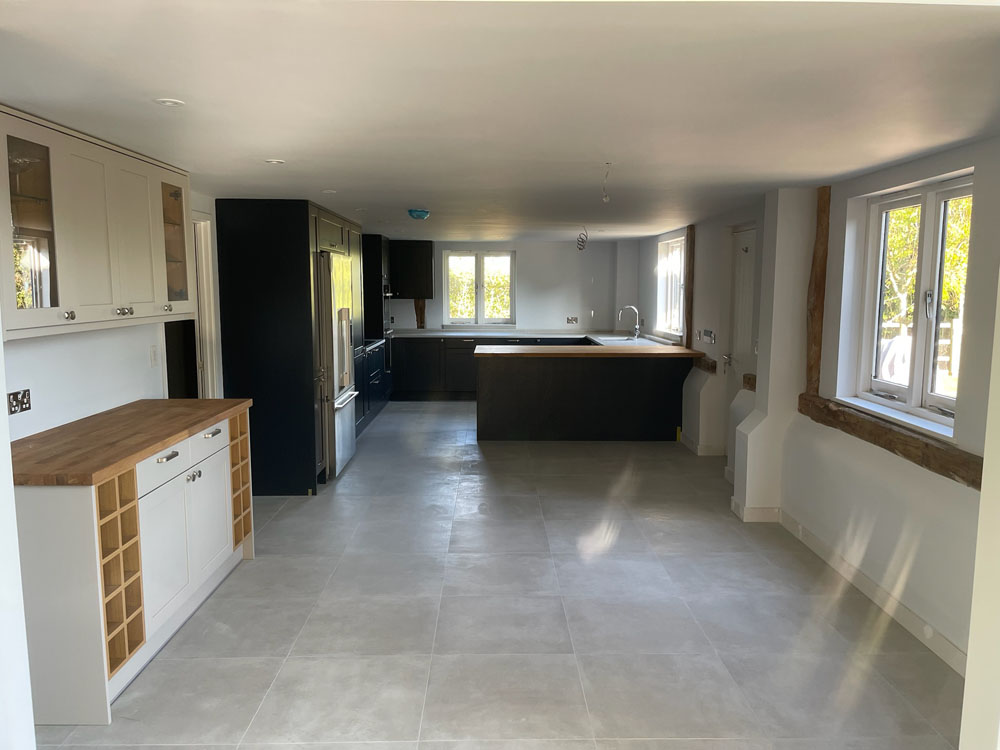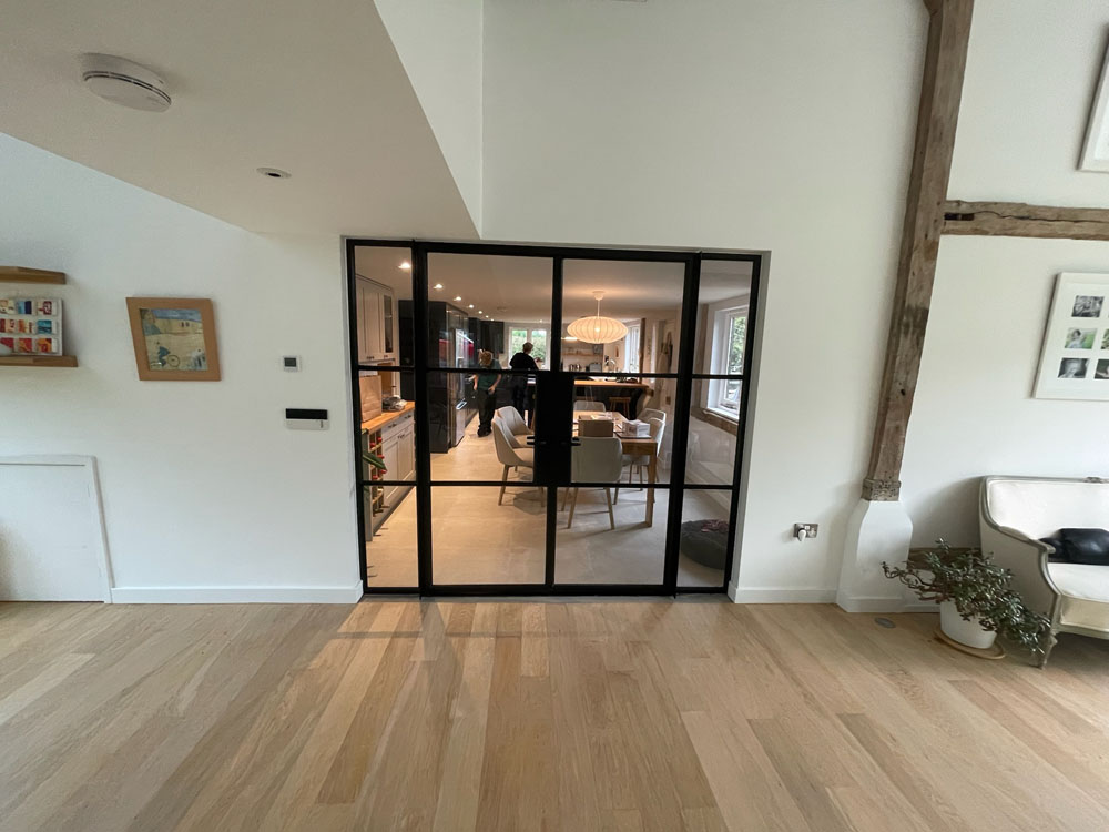 We removed an existing dated kitchen and utility room, carried out some structural alterations to open up this barn conversions living space installing crittal doors creating a divide but maintaining the open aspect.
